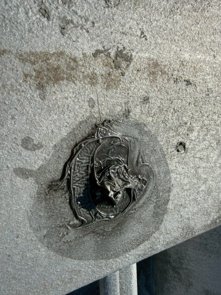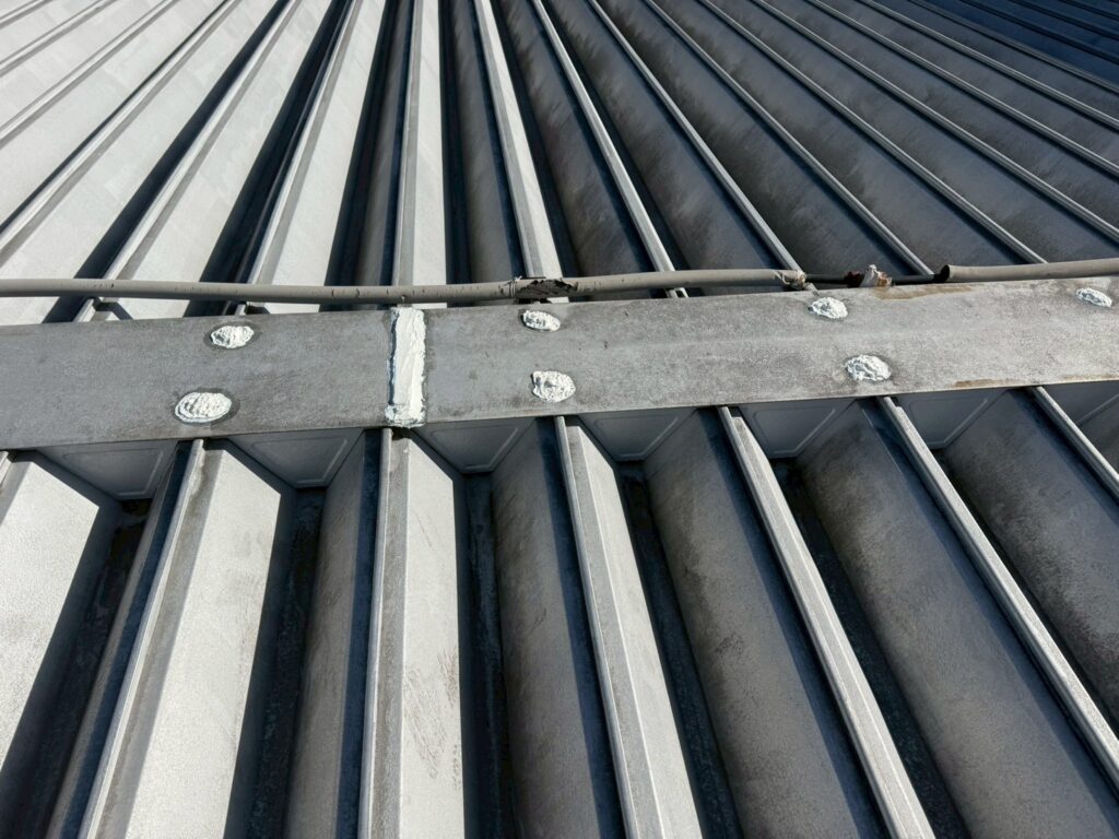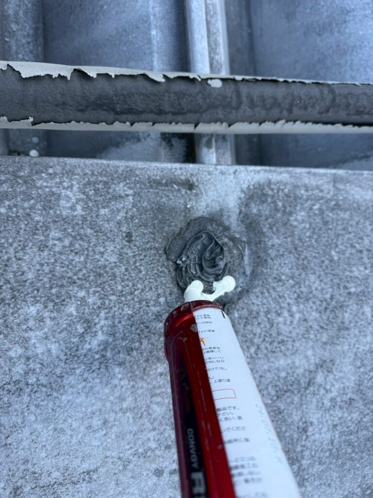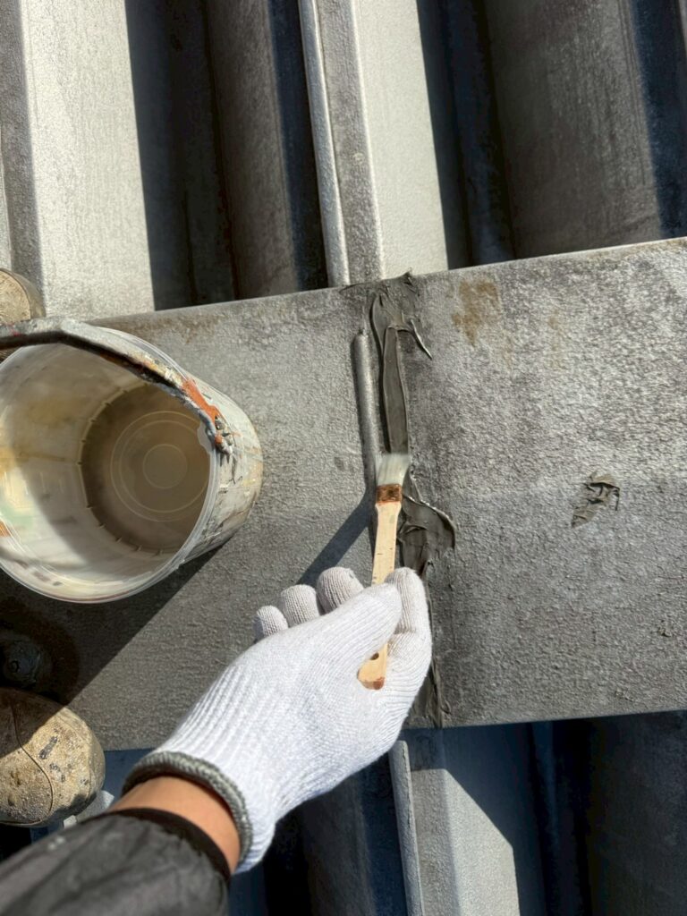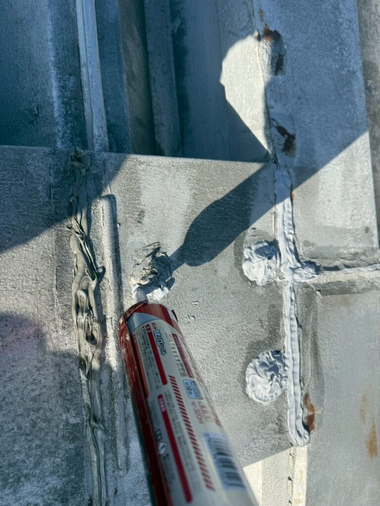 上尾市で行っている倉庫の屋根塗装現場では引き続きシール打ち作業を行いました。