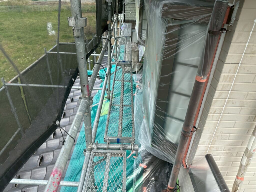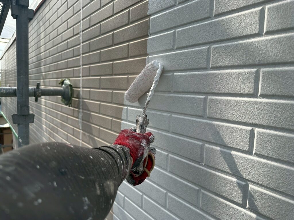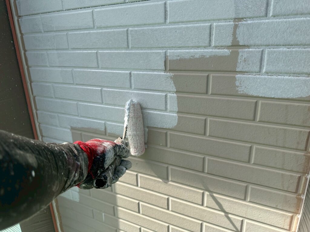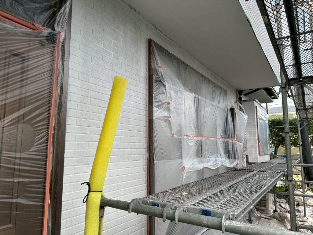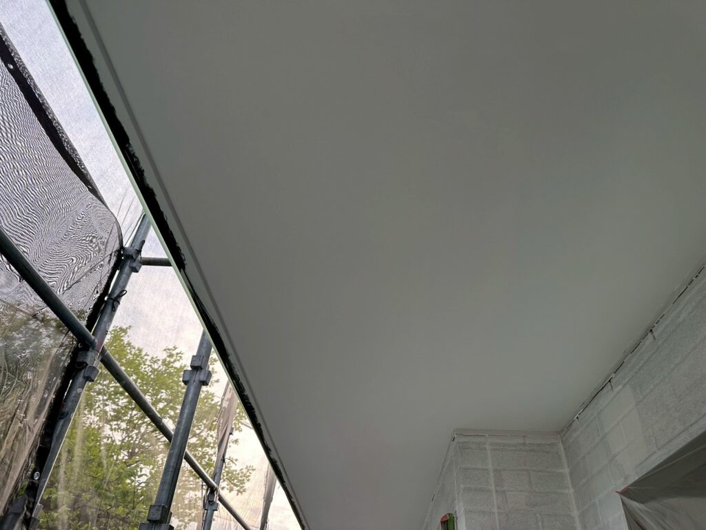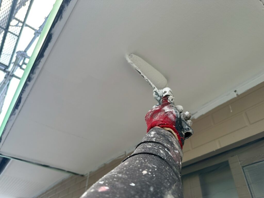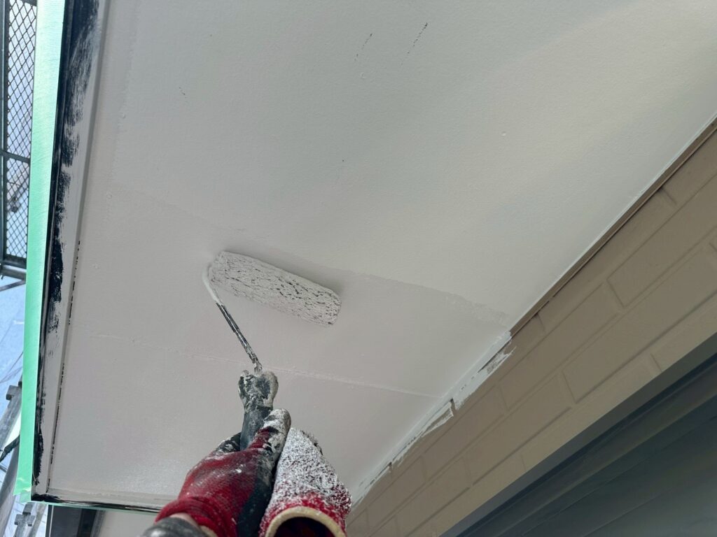 本日は軒裏塗装と外壁下塗り作業を行いました。