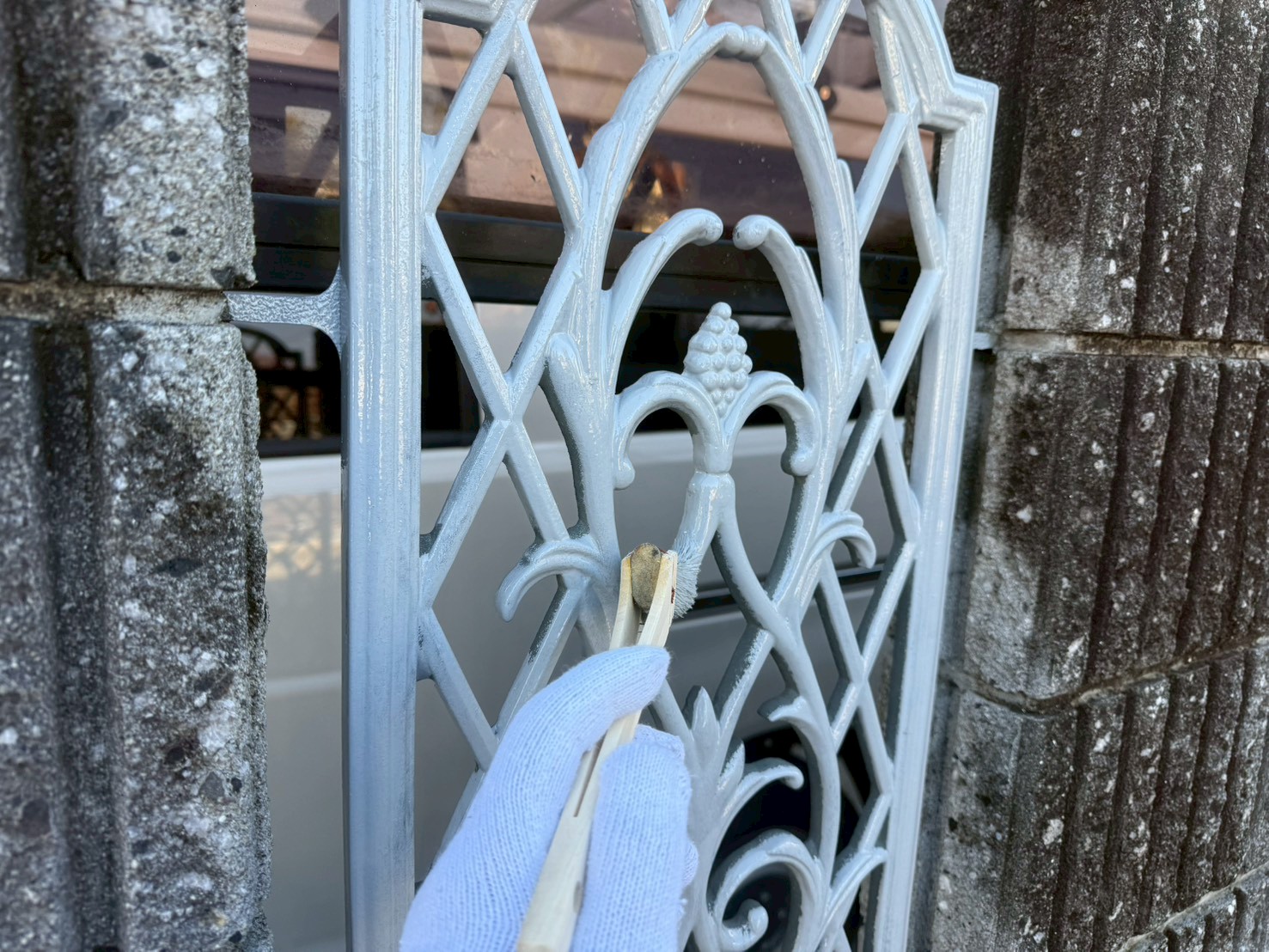 世田谷区の戸建てで門扉塗装作業を行いました。本日は高圧洗浄と下塗り作業です。