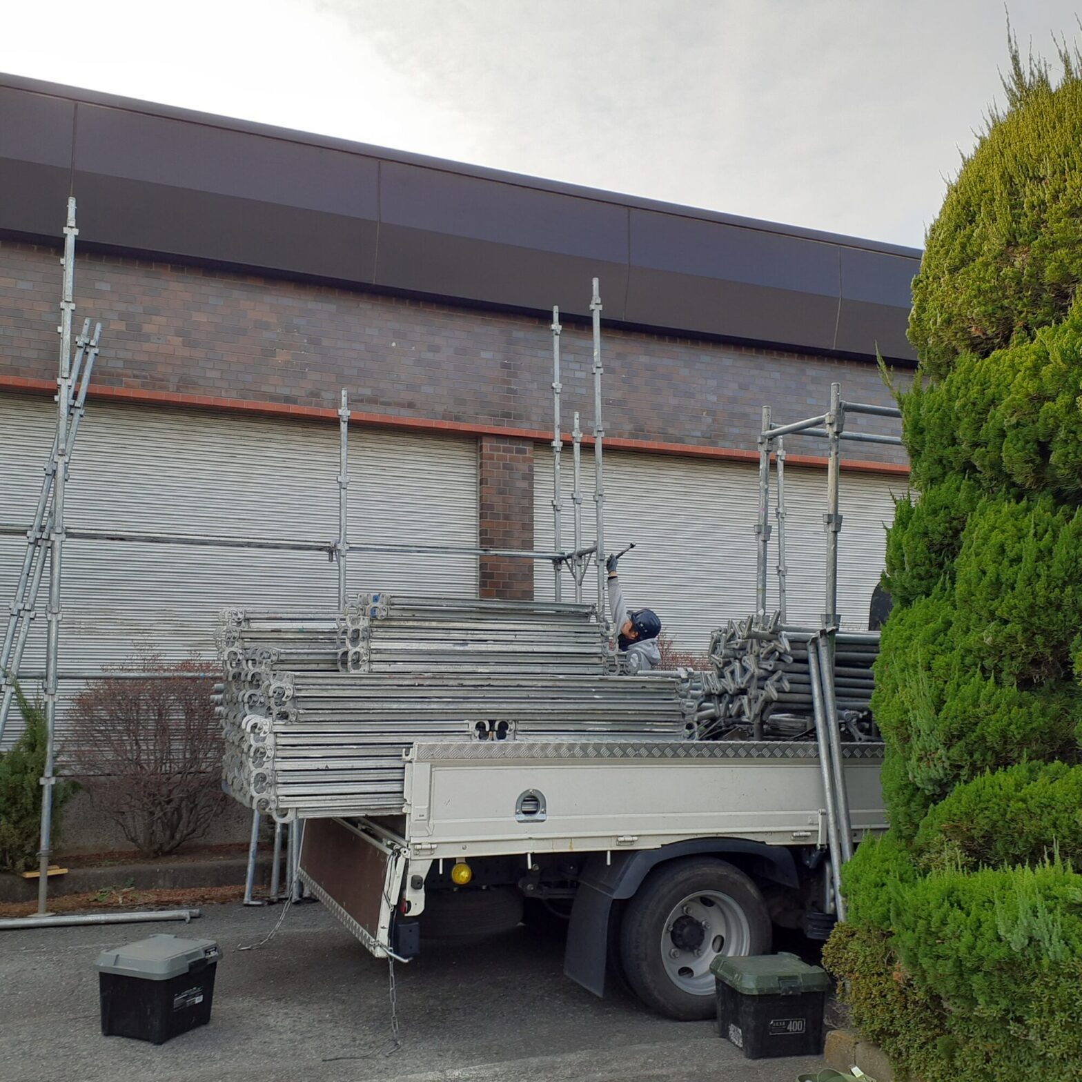 上尾市の倉庫屋根塗装工事が本日から開始となりました。本日は足場を設置しました。2日間で予定組みましたが、1日で終了しました。